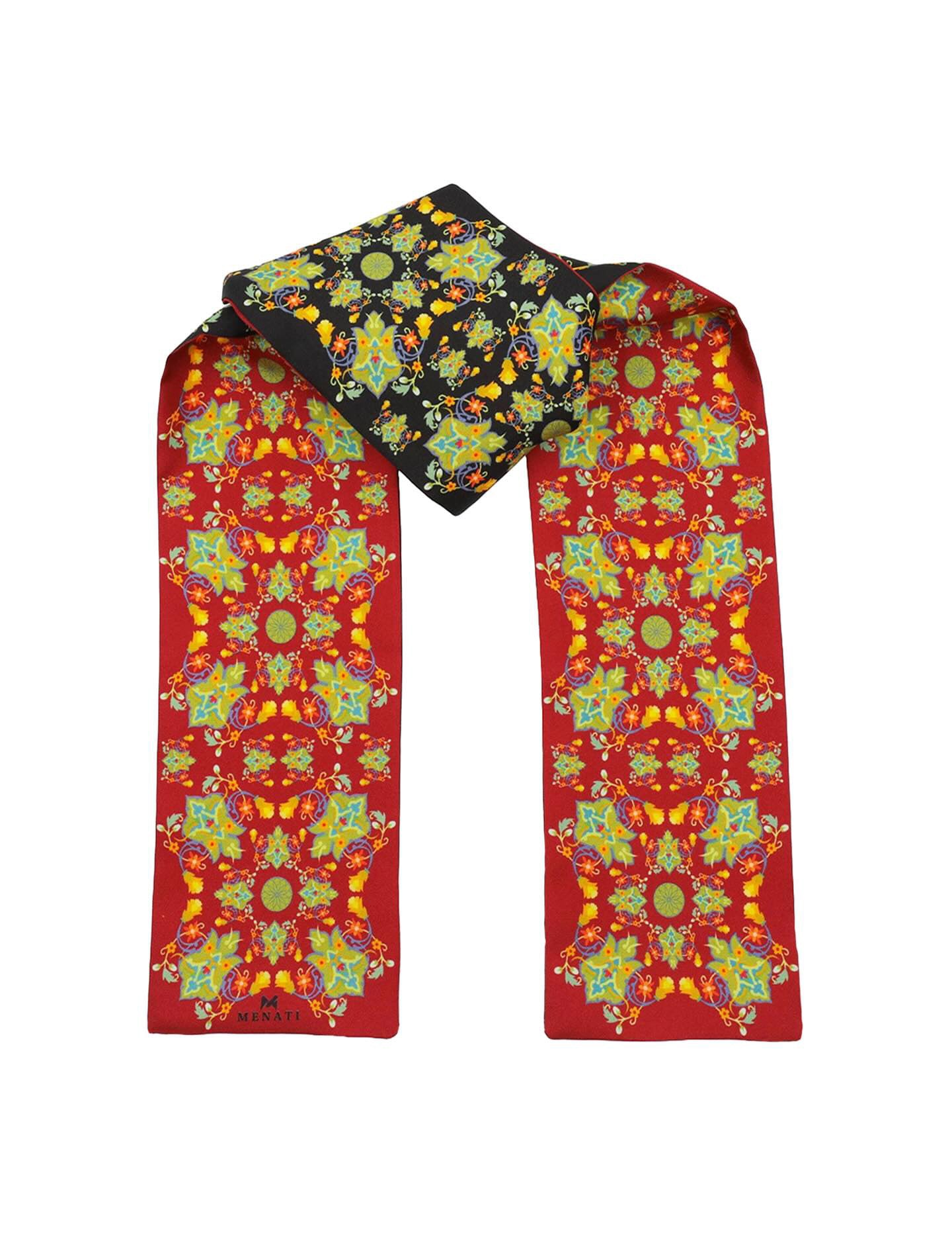 MENATI Reversible Neck-Scarf (Bandeau), an essential accessory for the fashion-conscious individual. This silk scarf, handmade in Italy, showcases exceptional craftsmanship and luxurious material. The double-sided feature allows you to switch between two stunning designs, making it a versatile addition to your wardrobe.